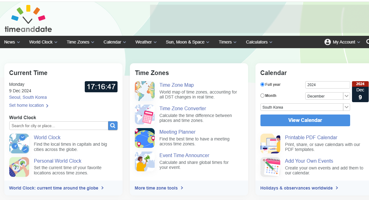 해외에서도 인기 있는 시간과 날짜(Time and Date) 웹사이트는 글로벌 기준으로 일출·일몰 시간을 확인할 수 있는 서비스입니다. 직관적인 디자인과 함께 다양한 언어를 지원하여 누구나 쉽게 사용할 수 있습니다.