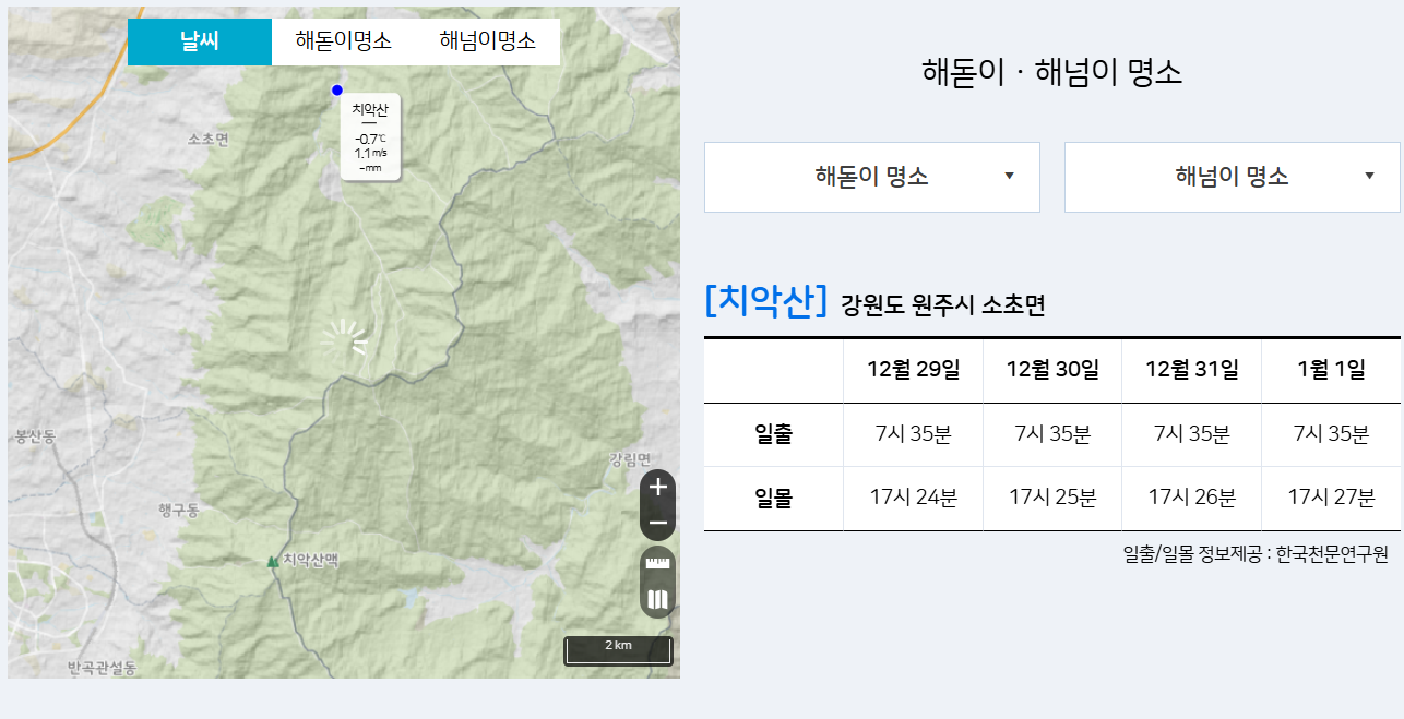 ① 방문 전 기상청 또는 일출·일몰 시간 제공 사이트를 통해 날씨와 시간을 확인하세요.