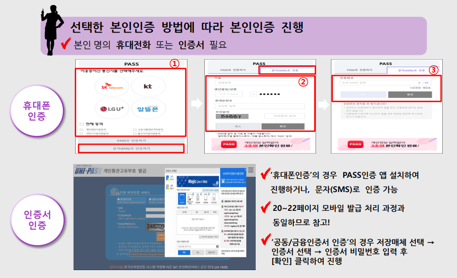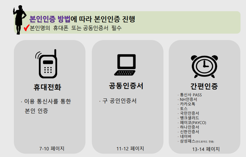 ③ 본인 인증을 진행합니다. 이는 공인인증서, 휴대폰 인증, 또는 간편 인증 방식을 통해 가능합니다.
