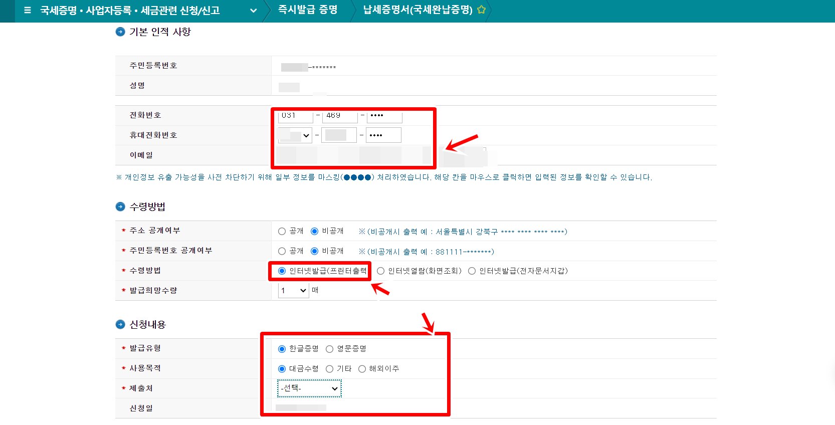 ⑤ 수령 방법 선택: 수령 방법에서 인터넷 발급을 선택합니다.