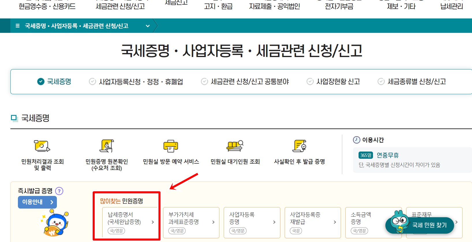 ③ 납세증명서 신청: 로그인 후, 홈페이지 상단의 메뉴에서 '납세증명서' 섹션을 찾아 '국세완납증명'을 선택합니다.
