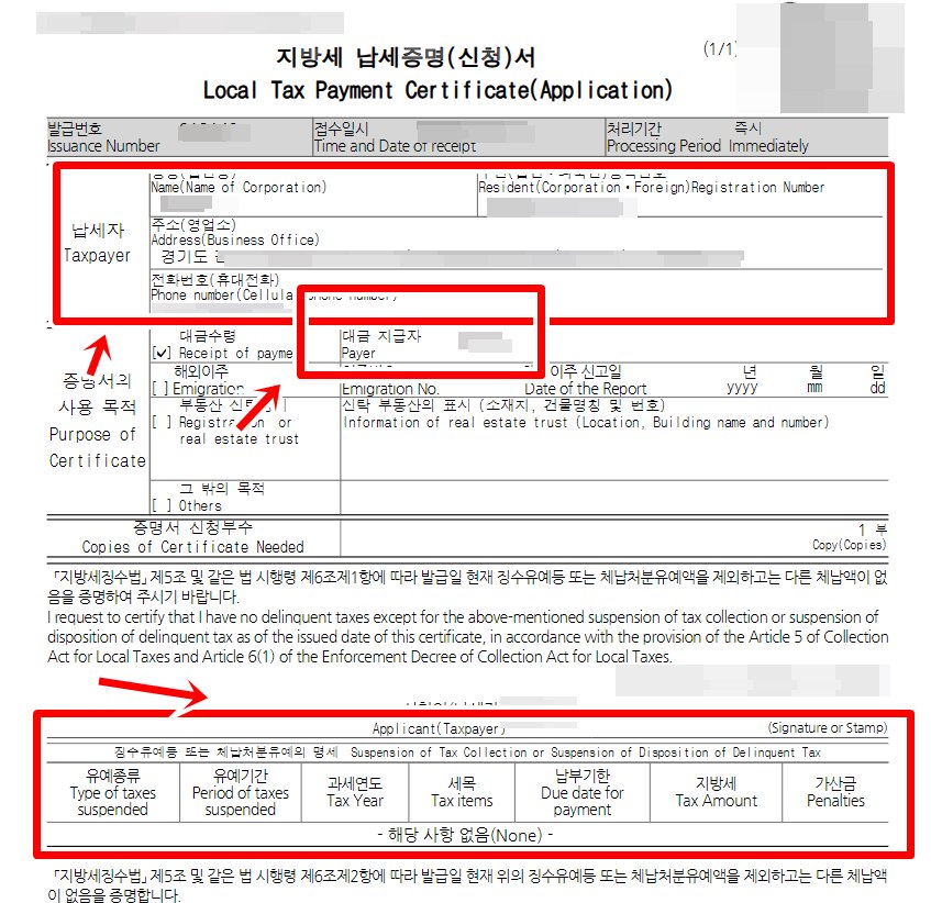 지방세 완납증명서: 지방자치단체에 납부해야 하는 세금에 대한 납부 상태를 증명합니다. 이는 재산세, 자동차세, 주민세 등 지방자치단체에 납부하는 세금을 포함합니다.(지방세)