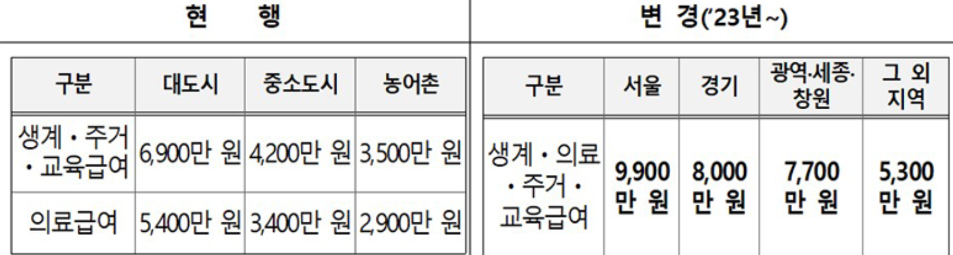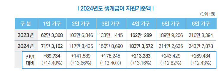 | 기준 중위소득 | 2,077,892 | 3,456,155 | 4,434,816 | 5,400,964 | 6,330,688 | 7,227,981 | 8,107,515 |