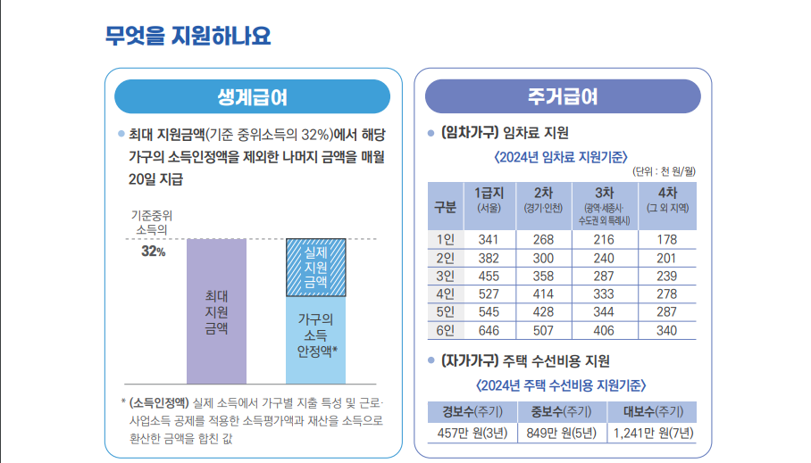 ① 생계급여: 기본적인 생활을 유지하기 위한 금전적 지원을 제공합니다. 이는 가구의 소득과 재산 상황에 따라 결정됩니다.