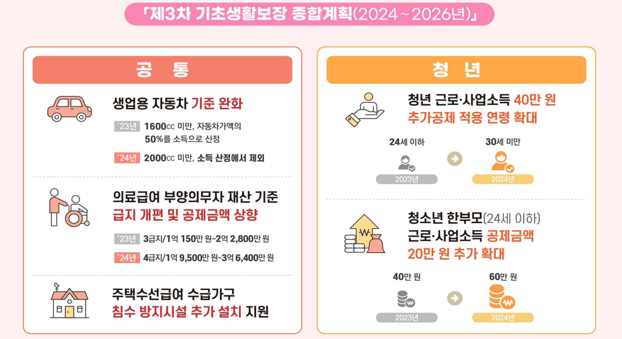 ③ 부양의무자 기준: 생계급여의 부양의무자 기준은 폐지되었습니다. 그러나 연소득이 1억원 이상 또는 부동산 9억원 이상 초과인 고소득 고재산 부양의무자는 제외됩니다. 의료급여의 경우 부양의무자 기준이 유지됩니다.