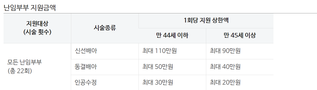 • 만 44세 이하의 경우: 신선배아 최대 110만원, 동결배아 최대 50만원, 인공수정 최대 30만원