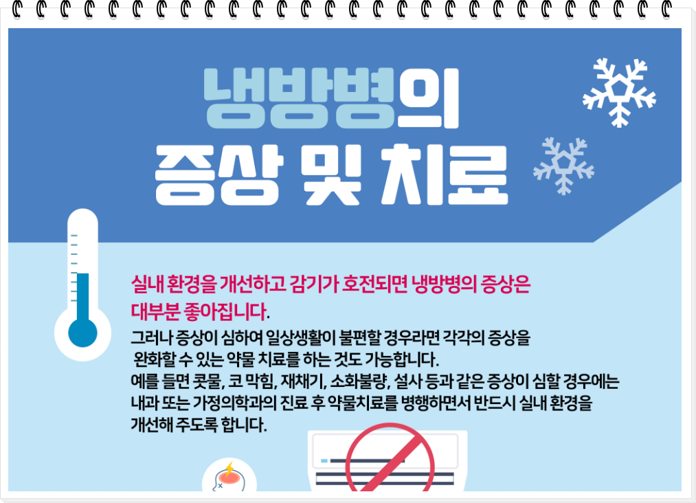 충분한 휴식 | 증상이 심할 경우 따뜻한 곳에서 충분히 휴식하여 체력을 회복합니다. |