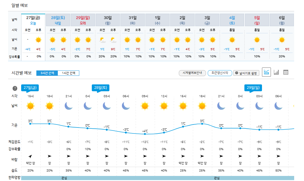 | 1월 28일 | 맑음, -5°C ~ 3°C | 맑음, -6°C ~ 2°C |