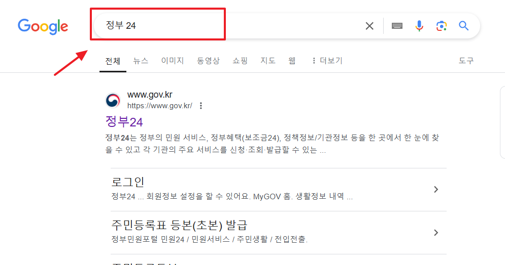 ① 정부24 사이트 접속: 정부24 웹사이트(www.gov.kr)에 접속합니다. 검색창에 '가족관계증명서'를 입력하고 발급 페이지로 이동합니다.