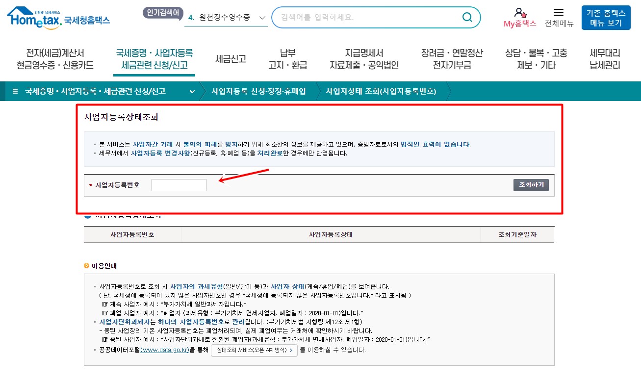 사업자등록번호를 알고 있다면 직접 입력하여 조회할 수 있습니다.