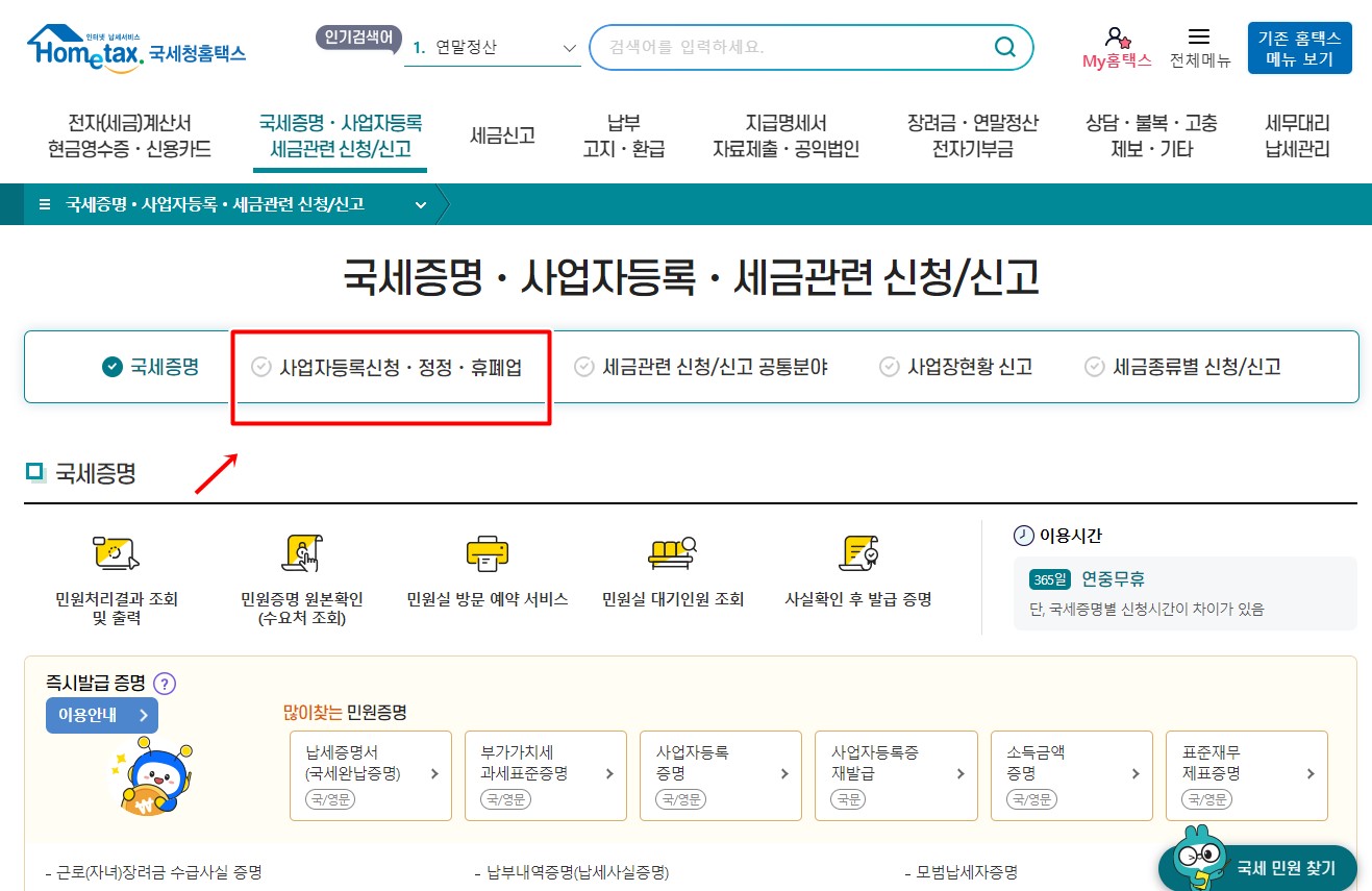 ⑦ 추가적으로 필요한 민원 서비스(휴·폐업 신고, 사업자 등록 신청 등)를 이용할 수 있습니다.