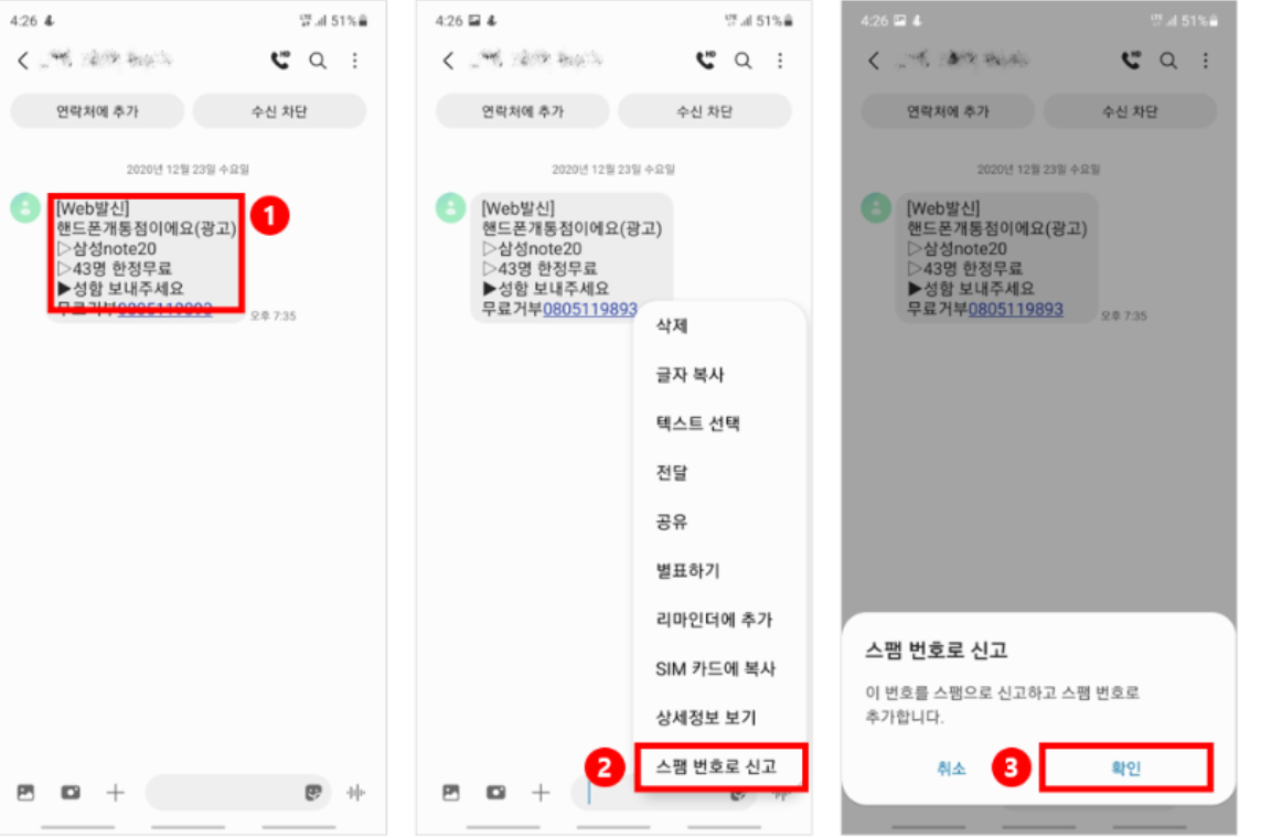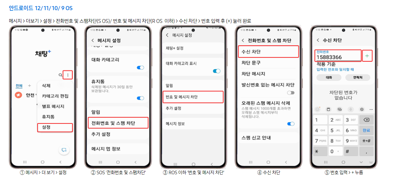 ② 번호 차단: 스팸으로 의심되는 특정 번호를 직접 차단 목록에 추가하여 더 이상의 메시지 수신을 차단합니다.