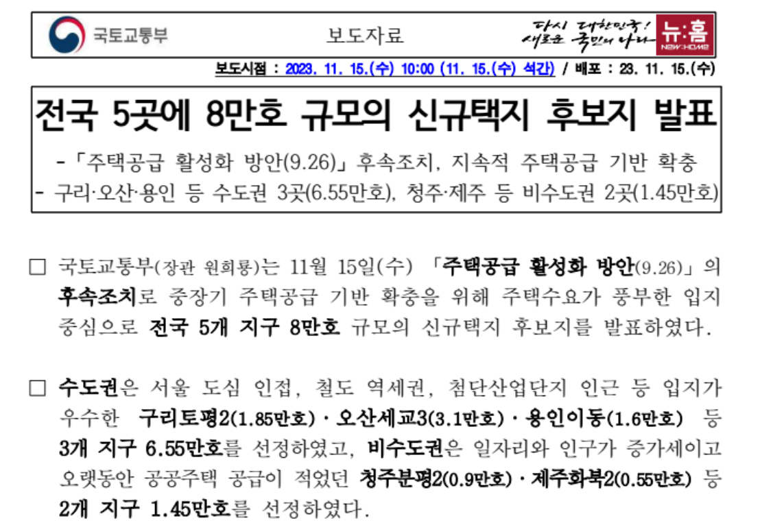 최근 국토교통부가 발표한 신규택지 후보지에 대한 소식은 많은 이들의 관심을 끌고 있습니다. 이번 발표는 전국적으로 8만 호의 주택을 공급하는 대규모 계획의 일환으로, 구리, 오산, 용인, 청주, 제주 등 5개 지역에 신규공급이 진행될 예정입니다. 이러한 신규택지 후보지 발표는 주택 시장에 어떤 영향을 미칠까요? 특히, 각 지역의 특성과 개발 계획은 어떻게 구성되어 있으며, 이들 지역의 주거 환경과 지역 경제에 어떤 변화를 가져올지 궁금증을 자아냅니다. 이 글에서는 신규택지 후보지 발표의 주요 내용과 그 의미, 그리고 각 지역별 특징과 전망에 대해 자세히 살펴보겠습니다.