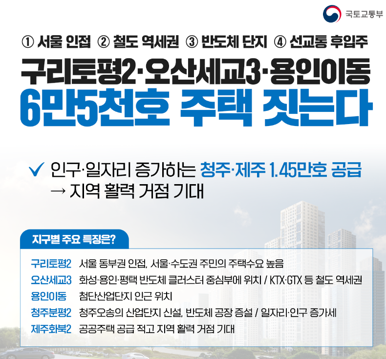 국토교통부의 신규택지 후보지 발표는 주택 시장에 새로운 활력을 불어넣고, 주거 안정을 위한 중요한 단계입니다. 이번 발표는 전국적으로 8만 호의 주택을 공급하는 대규모 계획의 일환으로, 구리, 오산, 용인, 청주, 제주 등 5개 지역에 신규공급이 진행될 예정입니다. 이러한 신규택지 후보지 발표는 주택 시장에 어떤 영향을 미칠까요? 특히, 각 지역의 특성과 개발 계획은 어떻게 구성되어 있으며, 이들 지역의 주거 환경과 지역 경제에 어떤 변화를 가져올지 궁금증을 자아냅니다. 이 글에서는 신규택지 후보지 발표의 주요 내용과 그 의미, 그리고 각 지역별 특징과 전망에 대해 자세히 살펴보았습니다.
