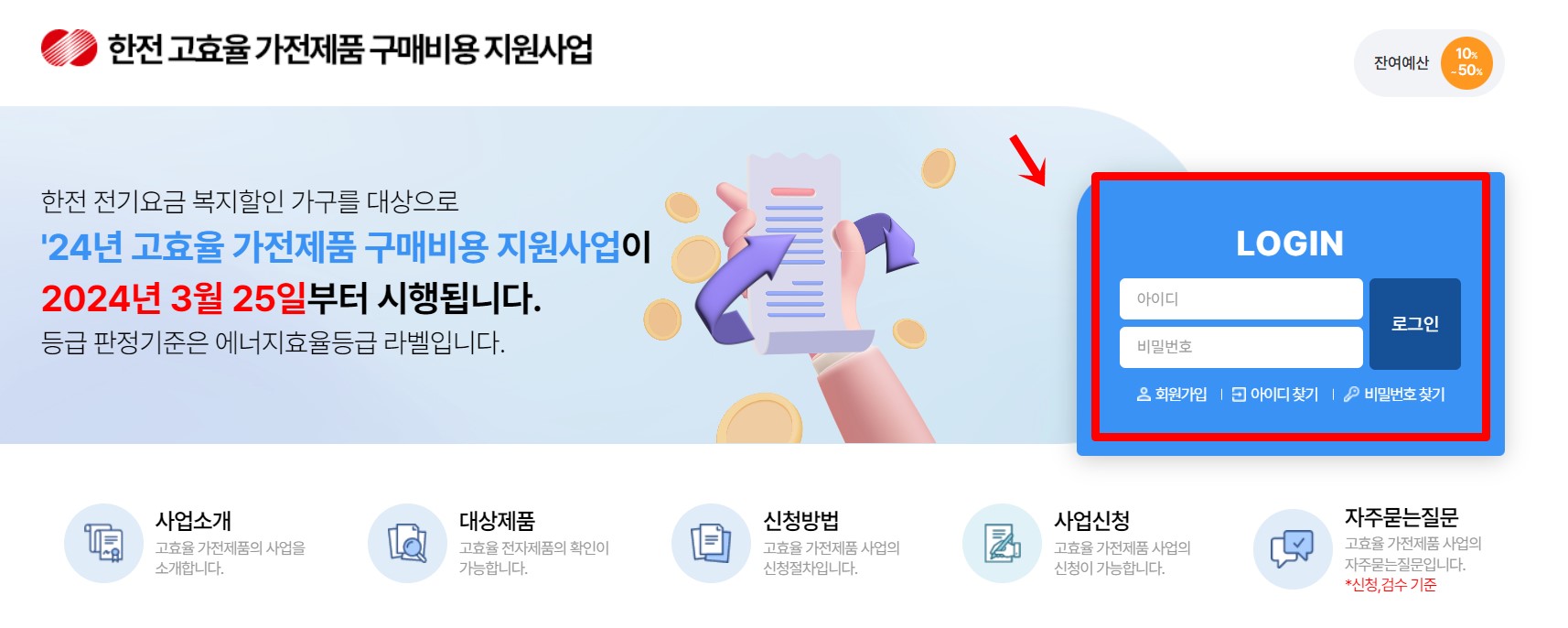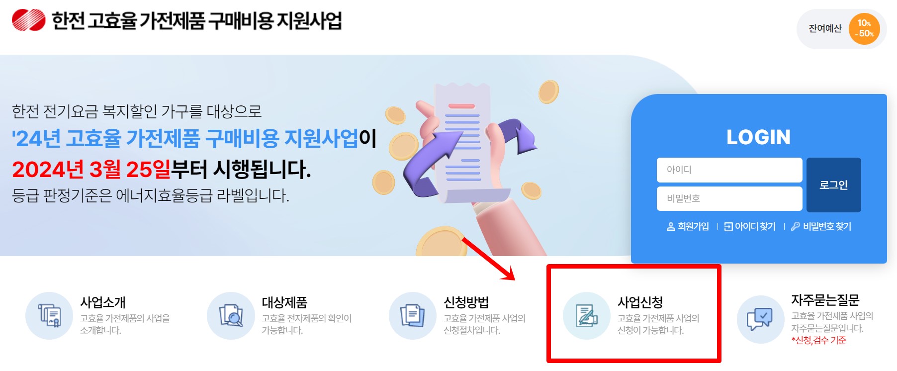 ① 한전 고효율 가전제품 구매비용 지원사업 홈페이지 접속: 먼저, 한국전력 공사의 고효율 가전제품 구매비용 지원사업 홈페이지에 접속합니다.
