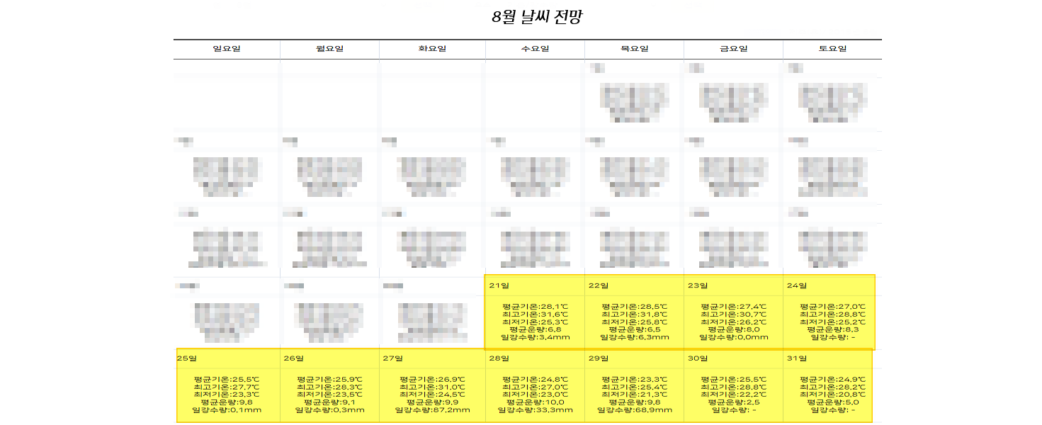 | 8월 5일 ~ 8월 8일 (주중) | 26°C ~ 31°C | 부분적으로 흐림 | 30% |