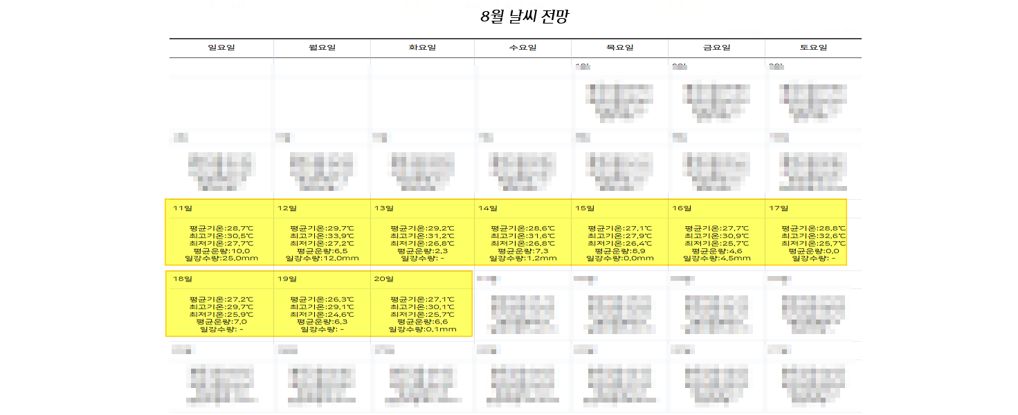 | 8월 12일 ~ 8월 15일 (주중) | 25°C ~ 30°C | 흐림 | 50% |