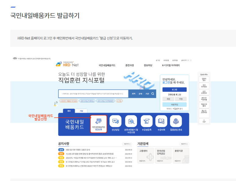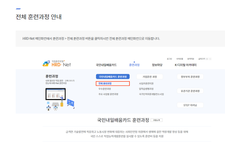 ① 직업훈련포털 HRD-Net 접속: 신청을 시작하기 위해 HRD-Net 웹사이트에 접속합니다.