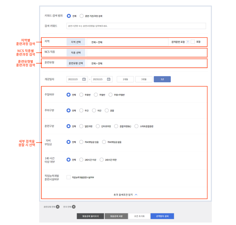① 훈련 과정 검색: HRD-Net에서 본인에게 맞는 훈련 과정을 검색합니다. 이때, 지역, NCS직종, 훈련유형, 개강일자 등을 고려하여 검색할 수 있습니다.