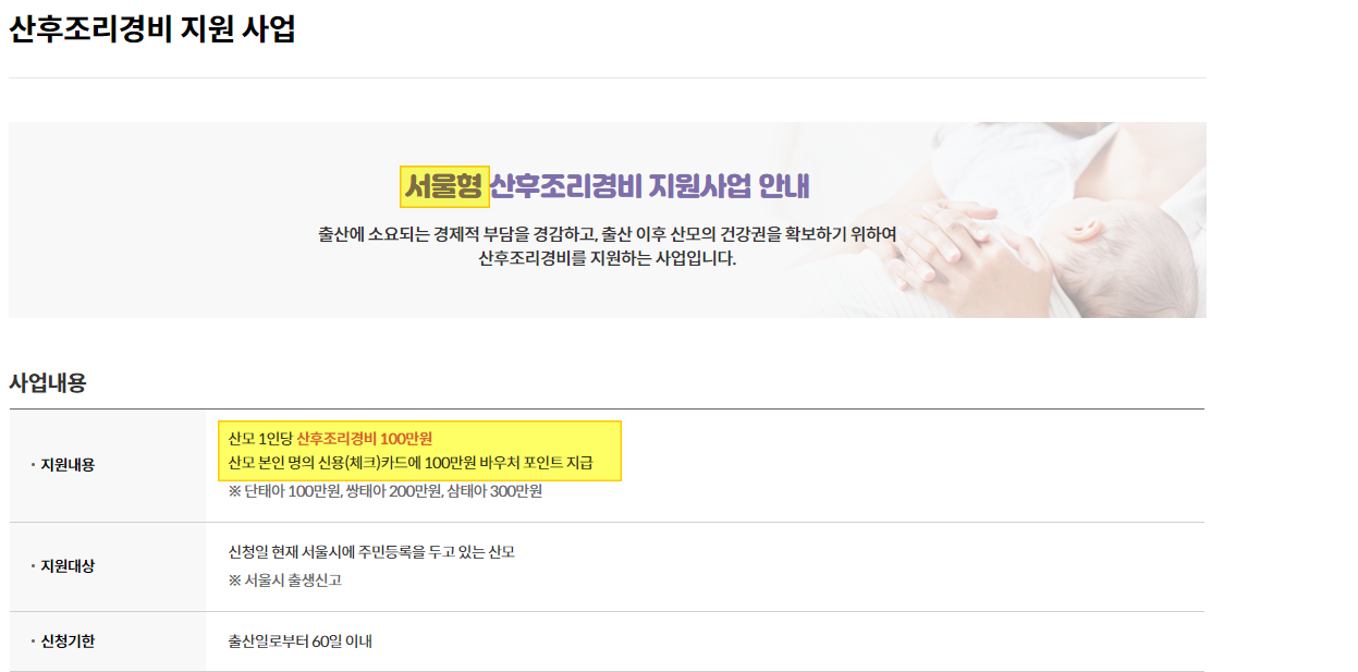 | 서울특별시 | 기본 지원금 + 추가 100만원 | 산후조리 경비 50만원 추가 지원 |