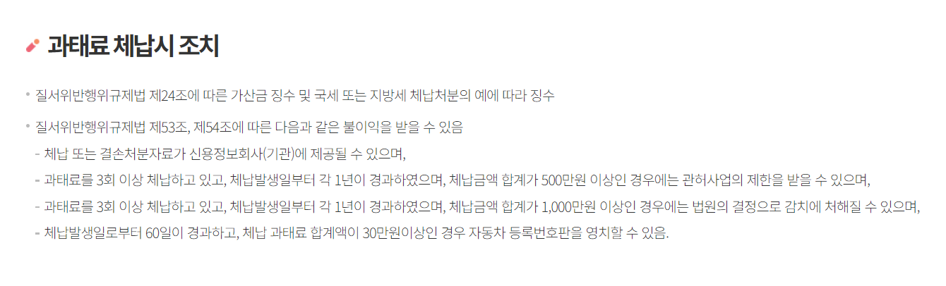 차량 압류 가능성: 장기간 과태료를 납부하지 않으면 차량 압류와 같은 법적 조치가 취해질 수 있습니다.