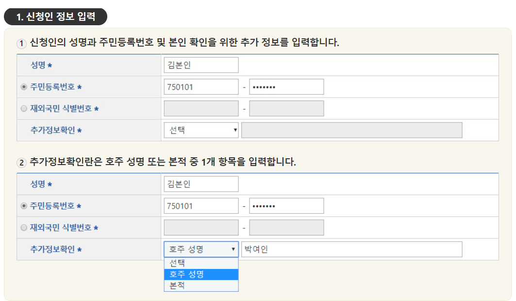 ① 주민등록번호: 신청인의 주민등록번호 입력이 필요합니다.