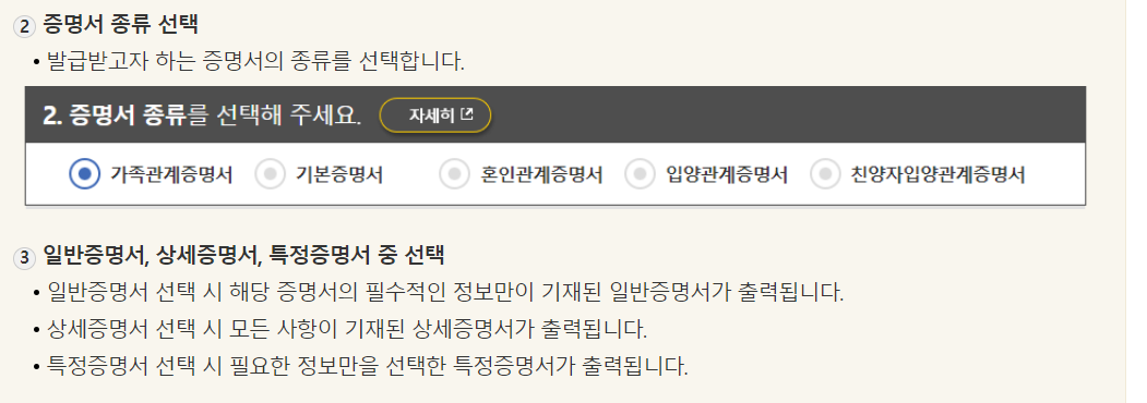 ④ 증명서 종류 선택: 발급받고자 하는 증명서의 종류를 선택합니다. 일반 혼인관계증명서 또는 상세 혼인관계증명서 중에서 선택할 수 있습니다.