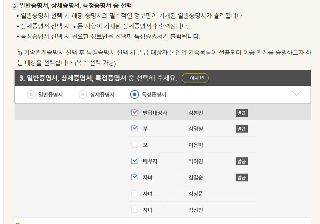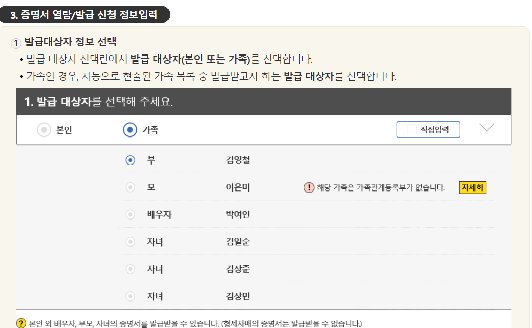 ② 가족 정보: 가족 중 한 명의 성명 입력이 필요할 수 있습니다. 이는 발급 대상자를 확인하기 위함입니다.
