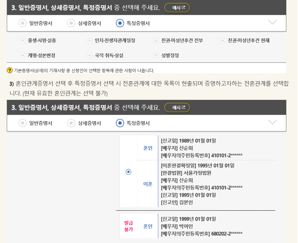 | 특정 | 본인에 관한 사항과 신청인이 선택한 과거의 혼인에 관한 사항 |