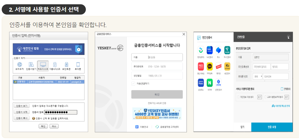 ① 본인 인증: 본인 인증은 공동인증서, 금융인증서, 간편인증 등을 통해 진행해야 합니다. 본인 인증 과정에서 제공되는 개인정보는 보안을 유지해야 합니다.