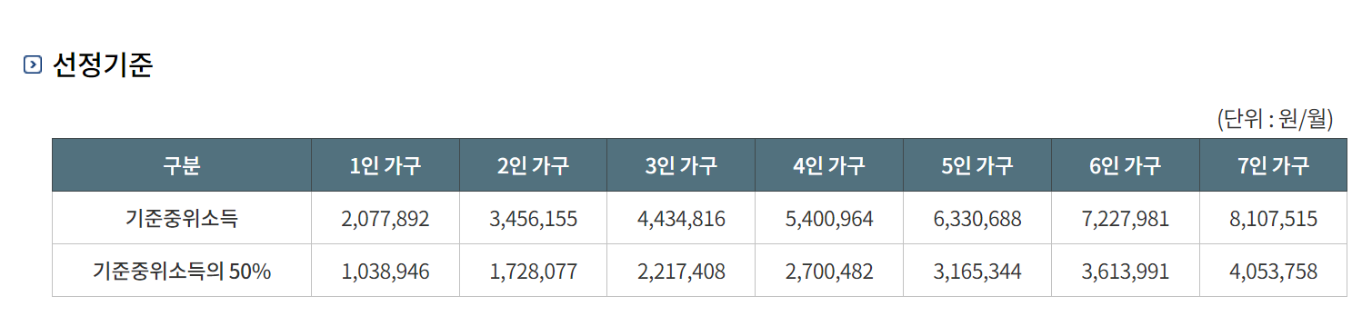 예를 들어, 2023년 기준 4인 가구의 경우, 중위소득의 50%는 약 540만 원입니다. 이 기준은 매년 변동될 수 있으므로, 최신 정보를 확인하는 것이 중요합니다.