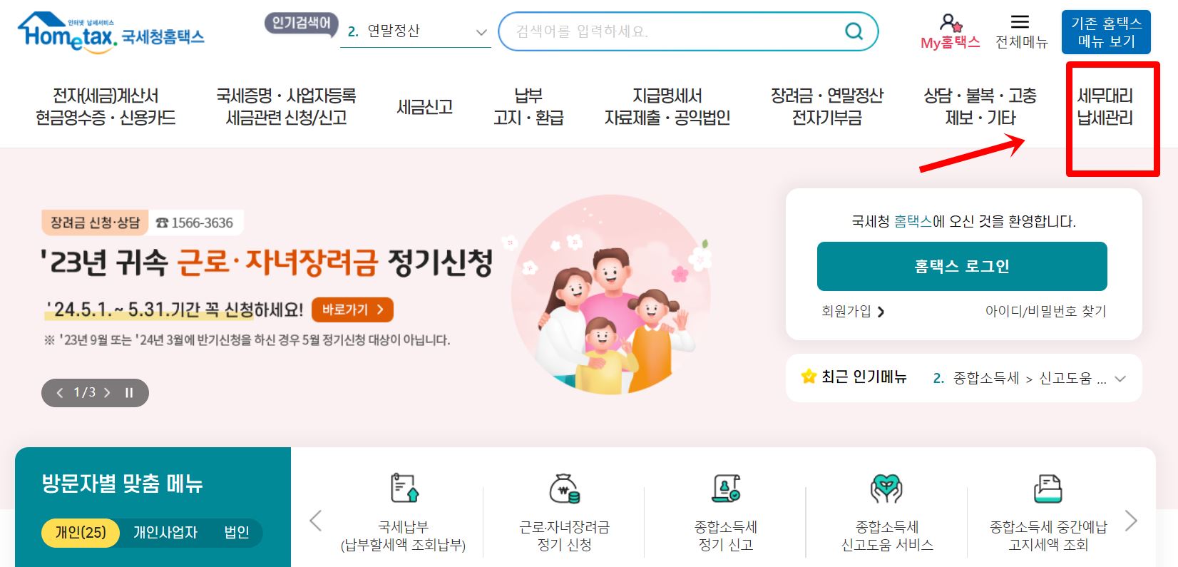② 상단 메뉴에서 '세무대리/납세관리'을 선택합니다.