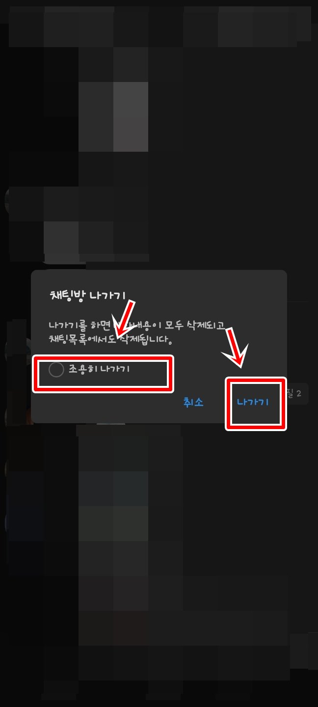 ④ '채팅방 나가기' 옵션을 클릭한 후, '조용히 나가기' 옵션을 찾습니다.