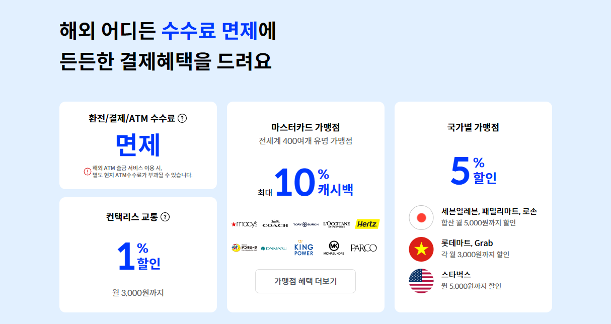 | 결제 수수료 | 해외 결제 시 수수료 없음 | 해외 결제 시 수수료 발생 (1~3% 정도) |