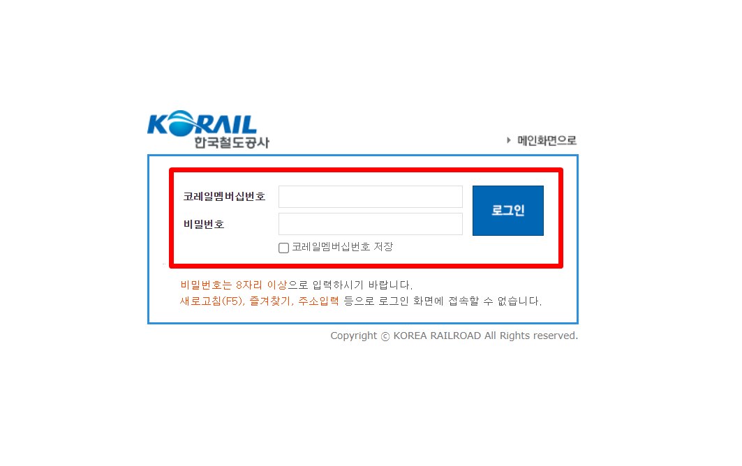 ② 멤버십번호 입력 : 코레일멤버십번호(아이디) 및 비밀번호를 입력하고 접속