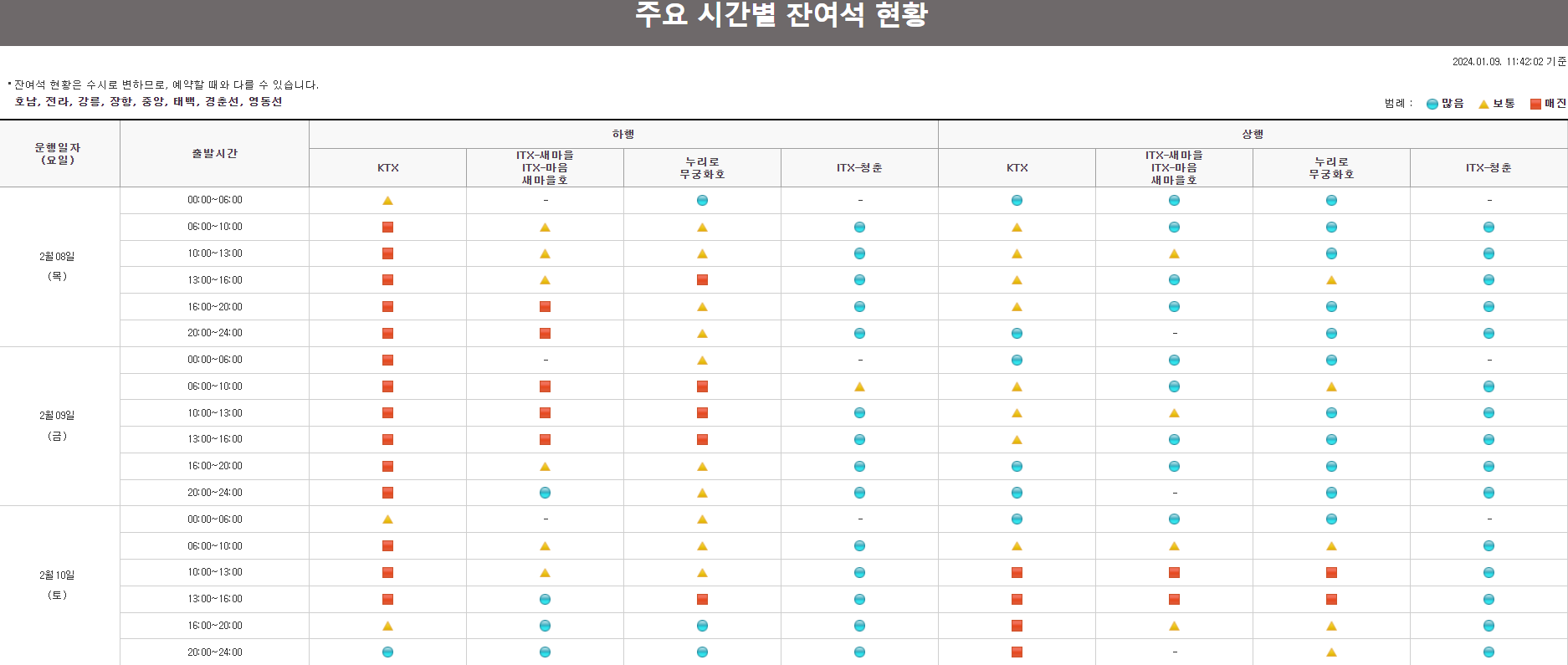 | 1/11(목) | 07:00 ~ 13:00 | 온라인 | 전용홈페이지 (PC/모바일) | 호남/전라/강릉/장항/ 중앙/태백/영동/경춘선 |