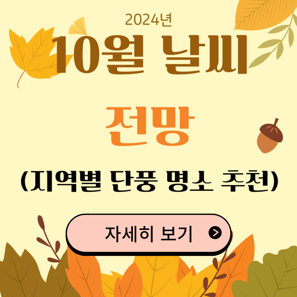 오늘 포스팅에서는 2024년 10월의 날씨 전망과 각 지역별 단풍 여행지 추천, 가을철 건강 관리 팁, 그리고 야외 활동 시 주의사항에 대해 상세히 알아보았습니다. 서울부터 제주까지 다양한 지역의 날씨와 여행 정보를 통해 가을을 더욱 알차게 즐기실 수 있기를 바랍니다. 가을철에는 일교차가 크고 날씨가 변덕스러울 수 있으므로, 최신 날씨 정보를 확인하고 건강 관리에 유의하며 안전한 야외 활동을 즐기세요. 쌀쌀한 날씨에도 준비된 여행과 건강한 일상이 여러분의 가을을 더욱 빛나게 할 것입니다!