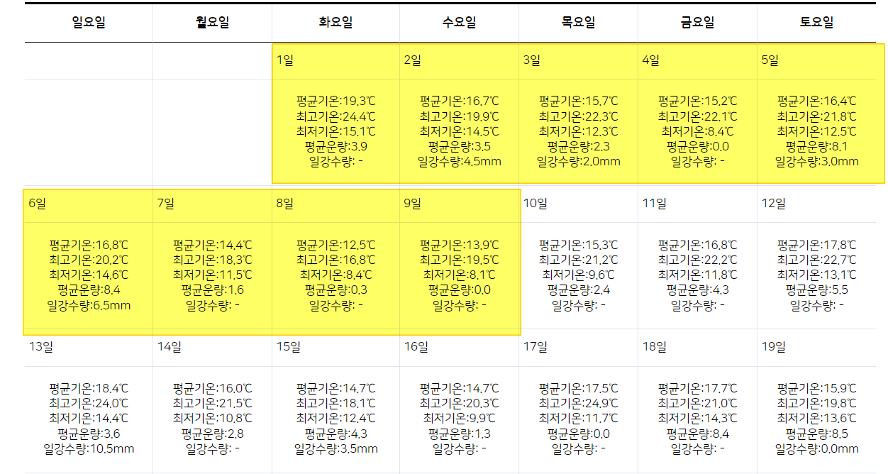 | 10월 1일(임시 공휴일) | 흐리고 비, 낮 최고 기온 20도 | 맑고 선선한 날씨, 낮 최고 기온 23도 |