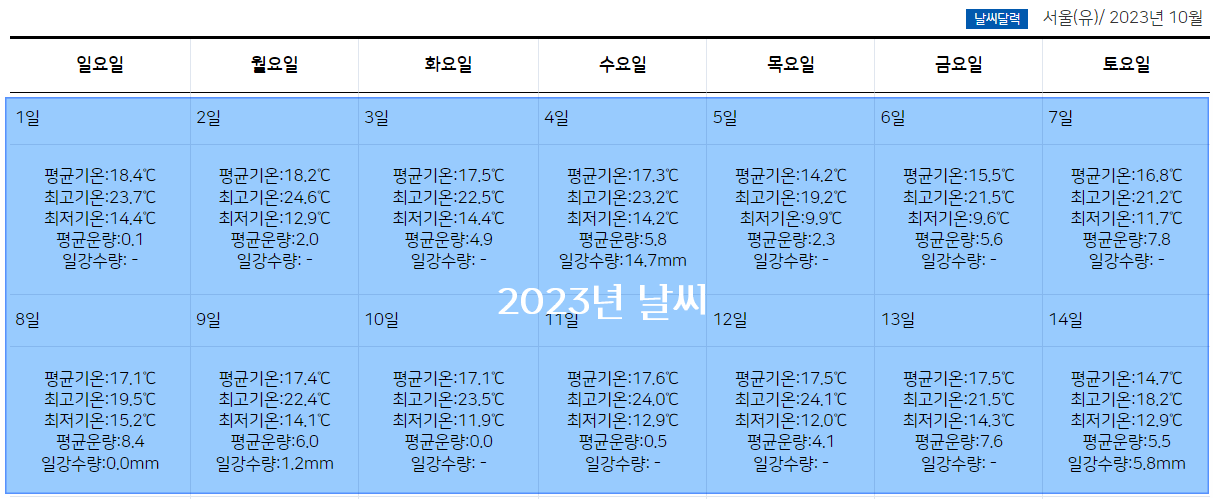 | 10월 9일 (한글날) | 흐리고 가끔 비, 낮 최고 기온 19도 | 맑고 따뜻한 날씨, 낮 최고 기온 23도 |