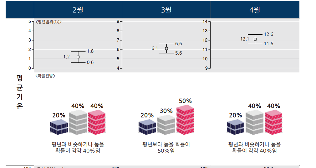 | 서울·인천·경기도 | 포근한 날씨 전망 | 5.0 ~ 6.0℃ | 20.0 ~ 46.1mm |