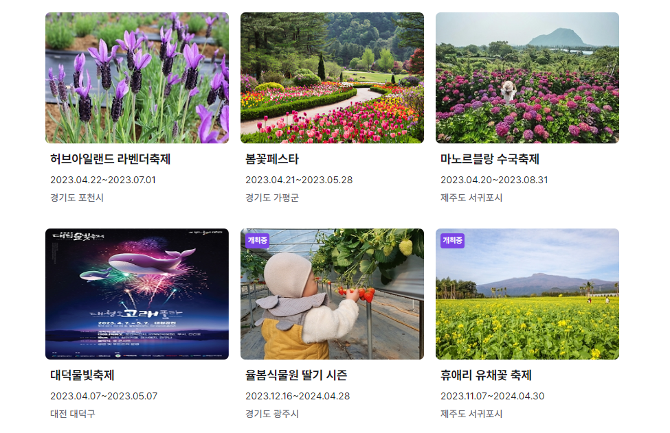| 마노르블랑 수국축제 | 2023.04.20~2023.08.31 | 제주도 서귀포시 |