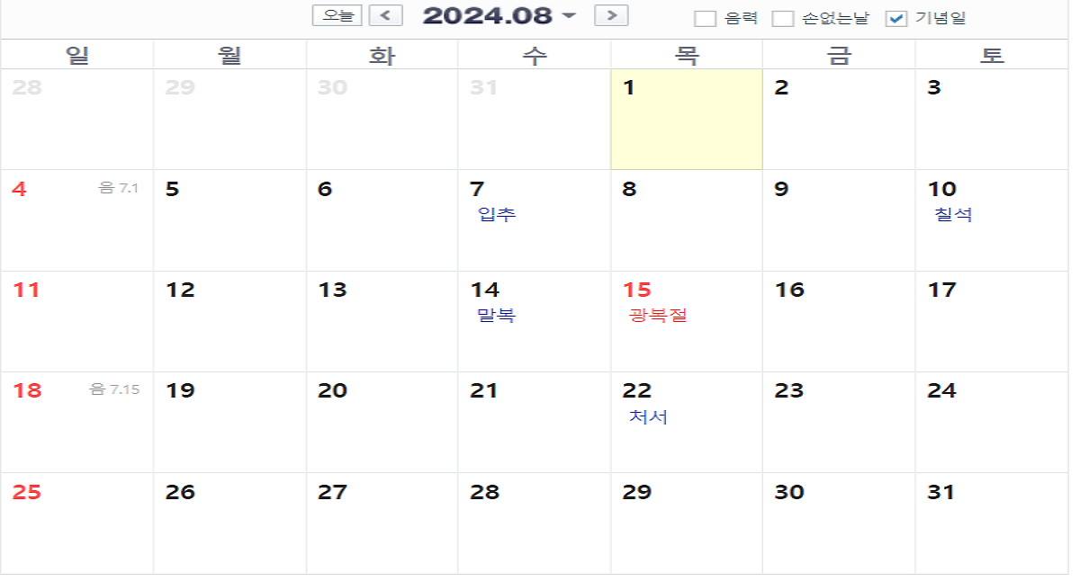 8월 7일 수요일 입추에는 다소 선선한 바람이 불며, 8월 10일 토요일 칠석에는 많은 비가 내릴 것으로 예상됩니다.