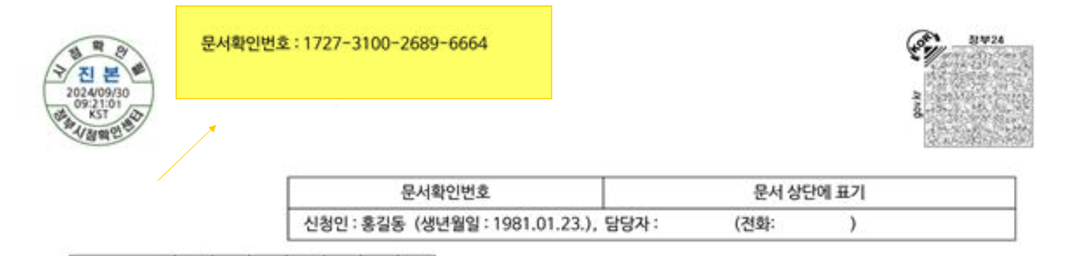 문서확인번호 입력: 발급된 인감증명서 상단에 있는 16자리 문서확인번호를 확인합니다. 이 번호를 정부24 홈페이지 또는 정부24 앱에 입력하면 진위여부를 즉시 확인할 수 있습니다.