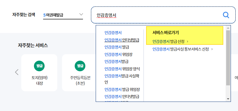 검색창에 '인감증명서' 검색: 로그인 후 메인 화면에서 '인감증명서'를 검색하여 해당 페이지로 이동합니다.