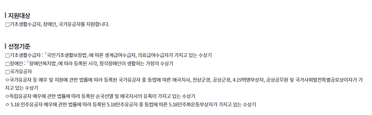 | 면제 대상 | 기초생활수급자, 국가유공자, 장애인 등 |
