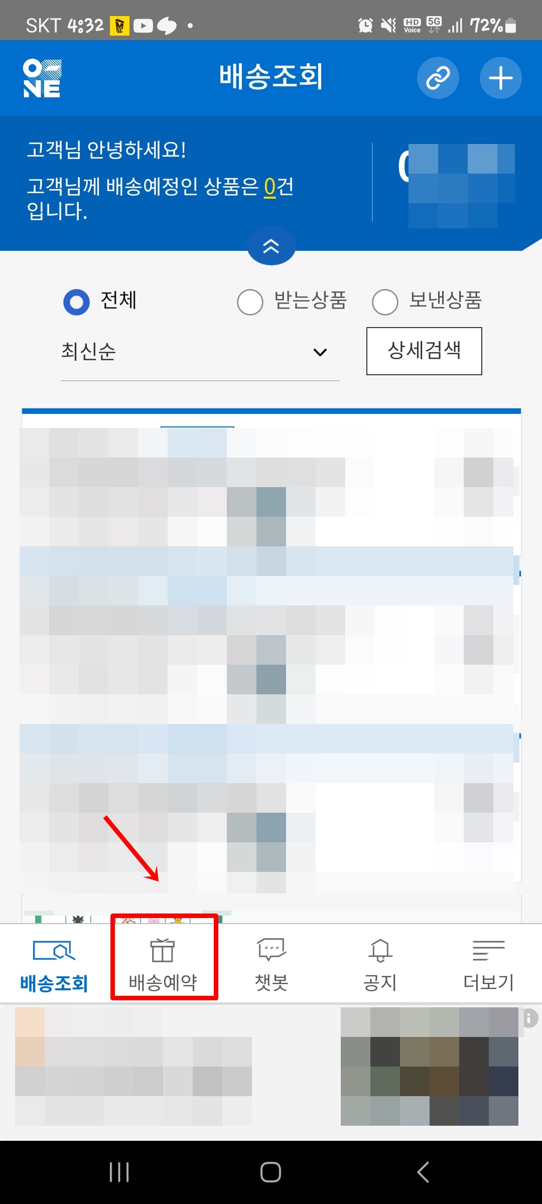 '배송조회 및 예약 탭' 선택: 웹사이트의 경우 상단 메뉴에서 '배송조회'를 선택하고, 모바일 앱의 경우 메인 화면에서 '배송조회' 기능을 선택합니다.