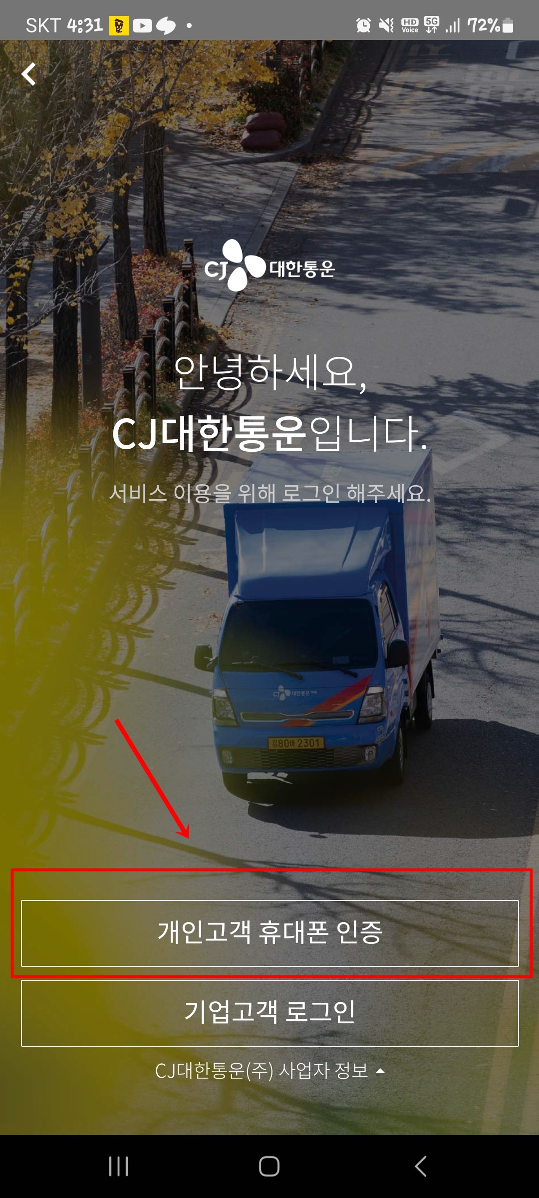 앱 실행 및 로그인: 앱을 실행한 후, CJ대한통운 회원 계정으로 로그인합니다. 비회원인 경우 앱에서 바로 회원가입을 진행할 수 있습니다.