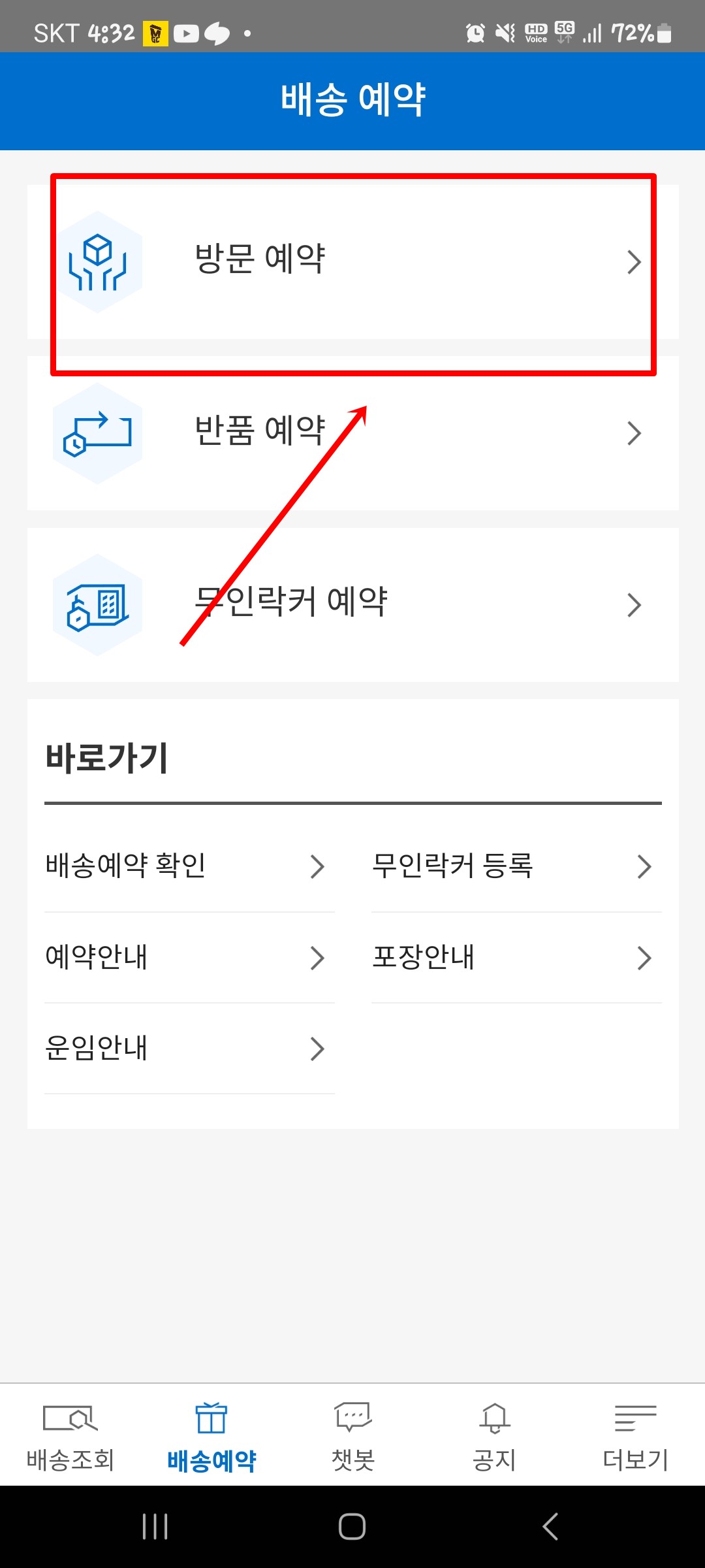 '배송 예약' 선택: 앱 메인 화면에서 '배송 예약' 메뉴를 선택합니다.