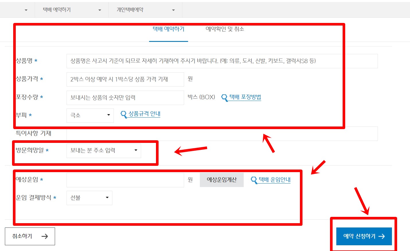 예약 정보 입력: 보내는 분과 받는 분의 정보(이름, 연락처, 주소) 및 택배 상품 정보를 입력합니다.