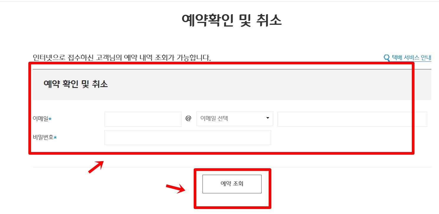 ④ 이메일 및 비밀번호 입력: 예약 시 입력한 이메일 및 비밀번호를 입력하고 예약 조회 탭을 클릭합니다.